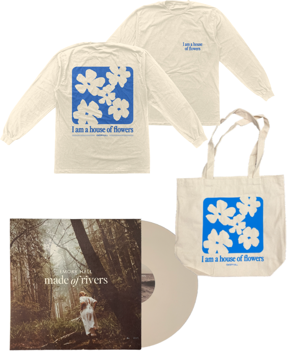 Bundle includes "I am a house of flowers" longsleeve tee, "I am a house of flowers" tote bag, and "Made of Rivers" vinyl.